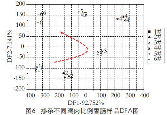 圖6為摻雜不同雞肉比例的香腸樣品判別因子分析圖。從圖6可見(jiàn)前2個(gè)判別因子的貢獻(xiàn)率分別為92.752%、7.141%,累計(jì)貢獻(xiàn)率99.893%。樣品在圖中的分布按照箭頭所示的方向呈現(xiàn)一定的規(guī)律性。具體分析來(lái)看,隨著摻雜雞肉比例的增加,分布區(qū)域朝DF1先增加后降低、DF2螺旋上升的趨勢(shì)發(fā)展。結(jié)果表明,摻雜不同雞肉比例豬肉腸樣品的DFA分析聚類(lèi)十分顯著。