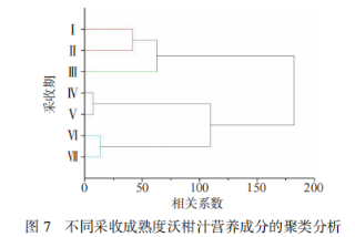 采用系統(tǒng)聚類分析方法對(duì)不同采收成熟度沃柑汁的營(yíng)養(yǎng)成分進(jìn)行R型聚類,聚類方法為組間聯(lián)接法,聚類區(qū)間為平方歐式距離,由圖7結(jié)果可知,采收期Ⅰ、Ⅱ沃柑汁歸為一類,采收期Ⅲ的沃柑汁歸為一類,采收期Ⅳ、Ⅴ沃柑汁歸為一類,采收期Ⅵ、Ⅶ沃柑汁歸為一類。綜合維生素C、總酚、氨基酸、類胡蘿卜素、檸檬苦素含量變化考慮,Ⅳ、Ⅴ采收期的沃柑營(yíng)養(yǎng)成分含量均較高。