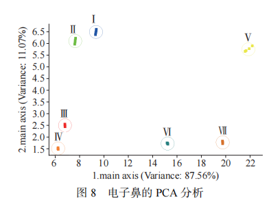 隨著果實(shí)成熟度的變化,不同采收期沃柑汁的電子鼻PCA分析結(jié)果如圖8所示。由圖可以看出,PCA分析圖橫坐標(biāo)代表第一主成分(PC1),其貢獻(xiàn)率為87.56%,縱坐標(biāo)代表第二主成分(PC2),其貢獻(xiàn)率為11.07%,前兩主成分的貢獻(xiàn)率累計(jì)為98.63%,能夠反映樣品的主要特征信息。同時(shí)PC1對(duì)區(qū)分不同采收期的沃柑汁起主要作用,基于電子鼻的分析結(jié)果發(fā)現(xiàn):不同采收期的沃柑汁可以很好區(qū)分,完全沒有重疊,說明隨著成熟度的變化,沃柑風(fēng)味不同,另外采收期Ⅰ與Ⅱ、采收期Ⅲ與Ⅳ的距離較近,說明Ⅰ與Ⅱ、Ⅲ與Ⅳ采收期的沃柑果汁風(fēng)味較接近。由此可見,不同采收成熟度的沃柑汁揮發(fā)性物質(zhì)不同,電子鼻可以準(zhǔn)確識(shí)別出不同成熟度沃柑汁的特征氣味,并進(jìn)行準(zhǔn)確區(qū)分