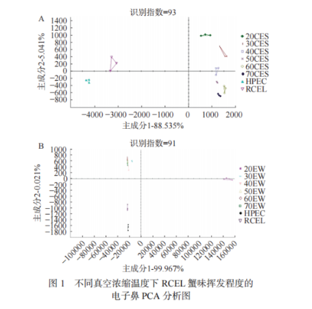 不同真空濃縮溫度下RCEL蟹味揮發程度的電子鼻主成分分析
