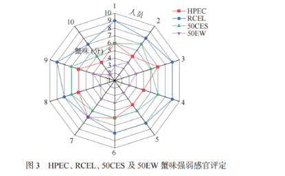 香氣感官評定 隨機選擇10名經過感官評定培訓的人員,對制備的HPEC、RCEL、50CES和50EW蟹味強弱進行評定,蟹味濃,取7~10分;蟹味稍濃,取4~7分;蟹味較淡,取0~4分。