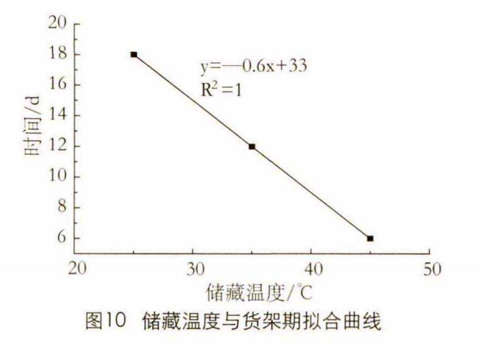 Q10值為溫度相差10 °C時(shí)食品的貨架期之比,該值用來(lái)確定溫度對(duì)反應(yīng)的敏感程度,大多數(shù)據(jù)為2。由表1可知,3種溫度下青棵格瓦斯的貨架期數(shù)據(jù),計(jì)算得Q10為 1.5?2.0,平均值為 1.75。應(yīng)用Origin軟件對(duì)貨架期Y和溫度X的關(guān)系進(jìn)行曲線擬合,發(fā)現(xiàn)Y與X的關(guān)系最符合一次函數(shù),擬合方程為Y=-0.6X+33, R2=1。為驗(yàn)證模型的準(zhǔn)確性 ,實(shí)驗(yàn)選取28、38 °C儲(chǔ)藏,所得格瓦斯的貨架期分別為 18、10 d, 模型預(yù)測(cè)值為16.2、10.2 d,預(yù)測(cè)值的相對(duì)誤差率在-1 0 %?2 % , 誤差較小,說(shuō)明此模型可快速地對(duì)青棵格瓦斯貨架期進(jìn)項(xiàng)初步預(yù)測(cè)。
