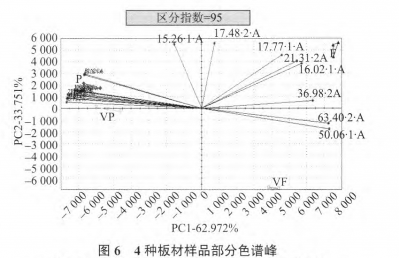 為減少試驗過程中的誤差,選取試驗中的3組數(shù)據(jù)進行分析。根據(jù)試驗方法,選擇試驗結(jié)果中的全部色譜峰進行PCA分析,得到圖5。當(dāng)區(qū)分指數(shù)(Discrimination index)>80時就可以認(rèn)為二者區(qū)分度較好,且數(shù)值越接近100區(qū)分度越高。由圖5可知,主成分1(PC 1)即橫坐標(biāo)對4種板材的區(qū)分度為62.493%,主成分2(PC 2)縱坐標(biāo)的區(qū)分度為30.369%。電子鼻將所有的區(qū)別因素化繁為簡,綜合提取了兩種區(qū)分因素即PPC l和PC 2便可將4種板材樣品區(qū)別開來。4種板材的區(qū)分指數(shù)為97,這說明Heracles II能夠很好地區(qū)分不同的人造板材樣品。