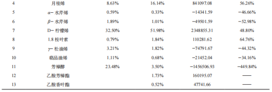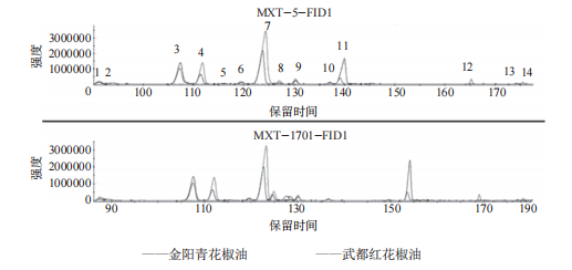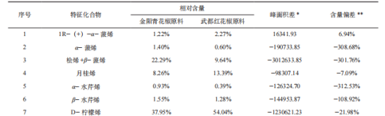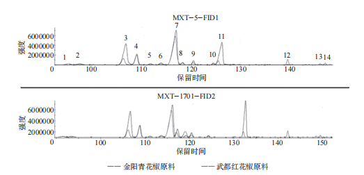 花椒作物在我國(guó)很多地區(qū)都有種植,花椒的揮發(fā)油是花椒香氣的主要來(lái)源,也是反映花椒香氣的主要指標(biāo),花椒中揮發(fā)油的含量及組成成分不僅受到花椒品種、產(chǎn)地環(huán)境因子(如產(chǎn)地氣候、雨量、日照時(shí)間、土質(zhì)等)的影響,還受到提取加工方法、提取部位和采收時(shí)期等外在因素的影響。 超快速氣相電子鼻技術(shù)具有分析速度快、靈敏度高和檢測(cè)費(fèi)用低等優(yōu)點(diǎn)。超快速氣相電子鼻將雙快速氣相色譜檢測(cè)與基于多變量統(tǒng)計(jì)的強(qiáng)大數(shù)據(jù)處理和感官及化學(xué)表征(Arochembase)的可選模塊相結(jié)合,利用超快速氣相電子鼻技術(shù),解析不同品種花椒及花椒提取物揮發(fā)性化合物,通過(guò)主成分分析建立產(chǎn)品有效判別模型,同時(shí)解析花椒物質(zhì)構(gòu)成。 不同產(chǎn)地花椒原料、花椒精油產(chǎn)品、花椒油產(chǎn)品、nC6-nC16標(biāo)準(zhǔn)溶液。 超快速氣相電子鼻;零空氣發(fā)生器;氫氣發(fā)生器;20mL頂空進(jìn)樣瓶,電子天平。 花椒:取0.2g花椒顆粒于20mL頂空進(jìn)樣瓶中,迅速加蓋密封檢測(cè),設(shè)置3個(gè)平行樣品,降低檢測(cè)誤差。 花椒精油:將花椒精油搖晃均勻后,取20uL于20mL頂空進(jìn)樣瓶中,加蓋密封檢測(cè),每個(gè)樣品設(shè)置3個(gè)平行樣。 花椒油:將花椒油搖晃均勻后,使用電子天平稱(chēng)取0.1g于20mL頂空進(jìn)樣瓶中,加蓋密封檢測(cè),設(shè)置3個(gè)平行樣品。 花椒原料:樣品量0.2g,進(jìn)樣體積500uL,孵化溫度80℃,孵化時(shí)間20min,50℃恒溫30s,1℃/s速率升溫至80℃恒溫30s,3℃/s速率升溫至125℃恒溫10s,3℃/s速率升溫至250℃恒溫11s。 花椒精油:取樣量100μL,捕集溫度40℃,孵化溫度60℃,孵化時(shí)間10min,載氣流量30mL/min;進(jìn)樣量1000uL,進(jìn)樣口溫度200℃,閥溫度為250℃;FID溫度260℃,升溫程序:初始溫度45℃,保持35s,1.0℃/s升至70℃,保持30s,0.5℃/s升至140℃,3.0℃/s升至250℃,保持21s,采集時(shí)間共計(jì)288s。花椒油:取樣量0.1g,捕集溫度40℃,孵化溫度60℃,孵化時(shí)間20min,載氣流量30mL/min;進(jìn)樣量500uL,進(jìn)樣口溫度200℃,閥溫度為260℃,F(xiàn)ID溫度為260℃,升溫程序:初始溫度50℃,保持30s,1.0℃/s升至85℃,保持30s,1.0℃/s升至125℃,保持10s,3.0℃/s升至250℃,保持10s,采集時(shí)間共計(jì)197s。 將裝有樣品的頂空小瓶按照順序依次放入樣品盤(pán),每3個(gè)平行樣品后面放入一個(gè)空瓶,目的是為了消除樣品帶來(lái)的信號(hào)干擾,選擇程序進(jìn)行樣品分析。 使用Heracles超快速氣相電子鼻自帶軟件Alphasoft進(jìn)行樣品數(shù)據(jù)處理,明確揮發(fā)性風(fēng)味物質(zhì)種類(lèi)與含量。 利用正構(gòu)烷烴標(biāo)準(zhǔn)溶液(nC6-nC16)進(jìn)行校準(zhǔn),進(jìn)行保留時(shí)間與保留參數(shù)之間的轉(zhuǎn)換,利用超快速氣相電子鼻自帶數(shù)據(jù)庫(kù)AroChembase數(shù)據(jù)庫(kù)對(duì)樣品中的成分進(jìn)行定性分析,采用峰面積歸一法對(duì)目標(biāo)化合物進(jìn)行定量分析,確定各香氣成分相對(duì)含量。 采用正構(gòu)烷烴標(biāo)準(zhǔn)溶液(nC6-nC16)對(duì)檢測(cè)方法進(jìn)行校準(zhǔn),結(jié)合超快速氣相電子鼻自帶AroChembase數(shù)據(jù)庫(kù)對(duì)樣品中主要揮發(fā)性成分進(jìn)行定性分析,推測(cè)得到匹配度高的化合物。 通過(guò)對(duì)比色譜圖(圖1)發(fā)現(xiàn),樣品間的出峰時(shí)間及出峰位置基本一致,峰面積間存在差異,說(shuō)明樣品中揮發(fā)性成分的種類(lèi)基本一致,含量上存在略微差異。 圖1 武都紅花椒、金陽(yáng)青花椒原料指紋圖譜 青花椒原料中共分析出11種含量較高成分,紅花椒原料中共分析出13種含量較高成分,乙酸芳樟酯與乙酸香葉酯在青花椒中未曾檢測(cè)出。通過(guò)計(jì)算,可知青、紅花椒不僅成分種類(lèi)上有差異,各成分含量上同樣差異明顯。除1R-(+)-α-蒎烯、1,8桉葉素、乙酸芳樟酯、乙酸香葉酯外,其他成分均是青花椒中含量較紅花椒高。其中,青紅花椒原料中芳樟醇含量差別最大,差異最為明顯,D-檸檬烯含量差別較大,但相對(duì)偏差不大,推斷不是造成青紅花椒風(fēng)味不同的主要差異。乙酸芳樟酯、乙酸香葉酯僅存在于紅花椒原料中,由此可利用花椒原料產(chǎn)品中芳樟醇、乙酸芳樟酯、乙酸香葉酯含量區(qū)分花椒原料種類(lèi)。 表1 武都紅花椒、金陽(yáng)青花椒原料特征化合物相對(duì)含量與峰面積差異 青花椒精油中共分析出11種含量較高成分,紅花椒精油中共分析出13種含量較高成分,乙酸芳樟酯與乙酸香葉酯在青花椒中未曾檢測(cè)出,與原料表現(xiàn)一致。通過(guò)計(jì)算峰面積差值和含量偏差可知,乙酸芳樟酯等酯類(lèi)物質(zhì)僅存在于紅花椒中。1R-(+)-α-蒎烯、月桂烯、D-檸檬烯、1,8桉葉素在紅花椒精油中含量較高,其他組分在青花椒精油中含量較高,和原料情況不一致,可能和提取工藝有關(guān)。其中芳樟醇含量差別最大,差異最為明顯,乙酸芳樟酯、乙酸香葉酯僅存在于紅花椒精油產(chǎn)品中,由此可利用花椒精油產(chǎn)品中檜烯、β-蒎烯、芳樟醇含量和乙酸芳樟酯、乙酸香葉酯等酯類(lèi)物質(zhì)存在與否來(lái)區(qū)分花椒精油種類(lèi)。 圖2 武都紅花椒精油、金陽(yáng)青花椒精油指紋圖譜 表2 武都紅花椒精油、金陽(