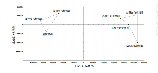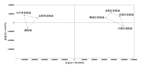 青花椒油中共分析出11種含量較高成分,紅花椒油中共分析出13種含量較高成分,乙酸芳樟酯與乙酸香葉酯在青花椒油中未曾檢測(cè)出。 通過(guò)計(jì)算峰面積差值和含量偏差可知,乙酸芳樟酯等酯類(lèi)物質(zhì)僅存在于紅花椒油中,與精油情況一致,青紅花椒油中芳樟醇含量差別最大,差異最為明顯,乙酸芳樟酯僅存在于紅花椒原料中,由此可利用花椒精油產(chǎn)品中檜烯、β-蒎烯、芳樟醇含量和乙酸芳樟酯、乙酸香葉酯等酯類(lèi)物質(zhì)存在與否來(lái)區(qū)分花椒精油種類(lèi)。對(duì)青紅花椒原料及花椒提取物進(jìn)行指紋圖譜與物質(zhì)定性分析,青紅花椒在成分種類(lèi)上有差異,紅花椒成分較青花椒復(fù)雜,主要體現(xiàn)在乙酸芳樟酯、乙酸香葉酯等酯類(lèi)和醛類(lèi)物質(zhì)上;青紅花椒各成分相對(duì)含量上差異明顯,其中芳樟醇、檜烯差異最為明顯,D-檸檬烯含量差別大,但差異貢獻(xiàn)度不大;芳樟醇、乙酸芳樟酯等成分可用來(lái)鑒別青紅花椒產(chǎn)品類(lèi)別,且電子鼻分析速度快,可大大節(jié)約成本。 圖3 武都紅花椒油、金陽(yáng)青花椒油指紋圖譜 表3 武都紅花椒油、金陽(yáng)青花椒油特征化合物相對(duì)含量與峰面積差異 主成分分析(PCA)是一種常見(jiàn)的多元統(tǒng)計(jì)方法,主要通過(guò)將采集的多指標(biāo)進(jìn)行數(shù)據(jù)轉(zhuǎn)換與降維,使用線(xiàn)性分類(lèi)處理降維的特征向量,盡可能捕集數(shù)據(jù)集間最大差異,從整體層面上直觀(guān)地展示樣品分布。對(duì)花椒原料、花椒精油、花椒油進(jìn)行主成分分析,由圖4原料主成分分析可以看出,兩種花椒原料之間存在顯著差異,現(xiàn)有數(shù)據(jù)可對(duì)未知產(chǎn)地的原料進(jìn)行產(chǎn)地區(qū)分,前提是原料來(lái)自?xún)蓚€(gè)產(chǎn)地。后續(xù)可收集其余產(chǎn)地花椒原料,積累大量數(shù)據(jù),建立原料質(zhì)量標(biāo)準(zhǔn),對(duì)實(shí)際應(yīng)用中采購(gòu)、生產(chǎn)、銷(xiāo)售提供指導(dǎo)性建議。 圖4 武都紅花椒、金陽(yáng)青花椒原料主成分分析 對(duì)6類(lèi)花椒精油樣品進(jìn)行PCA分析,結(jié)果如圖5所示,PC1與PC2相加大于91.38%,代表被檢測(cè)樣品中絕大部分信息,說(shuō)明實(shí)驗(yàn)的花椒精油樣品成分存在差異,呈現(xiàn)不同類(lèi)型風(fēng)味,主成分分析能對(duì)不同種類(lèi)花椒精油進(jìn)行識(shí)別與區(qū)分。 對(duì)四類(lèi)花椒油樣品進(jìn)行PCA分析,結(jié)果如圖6所示,PC1方差貢獻(xiàn)率為89.896%,PC2的方差貢獻(xiàn)率為0.953%,兩者累計(jì)方差為90.849%,主成分顯示樣品中絕大部分信息,說(shuō)明實(shí)驗(yàn)的花椒油樣品成分存在差異,呈現(xiàn)不同類(lèi)型風(fēng)味,主成分分析能對(duì)不同種類(lèi)花椒油進(jìn)行識(shí)別與區(qū)分。 利用超快速氣相電子鼻技術(shù),解析不同產(chǎn)地花椒及花椒提取物指紋圖譜,明確花椒及花椒提取物揮發(fā)性風(fēng)味物質(zhì),芳樟醇、乙酸芳樟酯等成分可用來(lái)鑒別青紅花椒產(chǎn)品類(lèi)別,且電子鼻分析速度快,可大大節(jié)約成本,利用超快速氣相電子鼻技術(shù)可識(shí)別花椒中的關(guān)鍵香氣成分,為花椒品種篩選、產(chǎn)地識(shí)別和深加工提供理論依據(jù)。