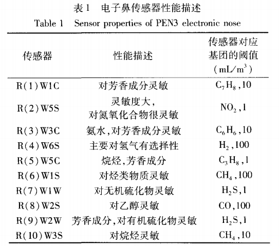 電子鼻傳感器性能描述見表 1 。