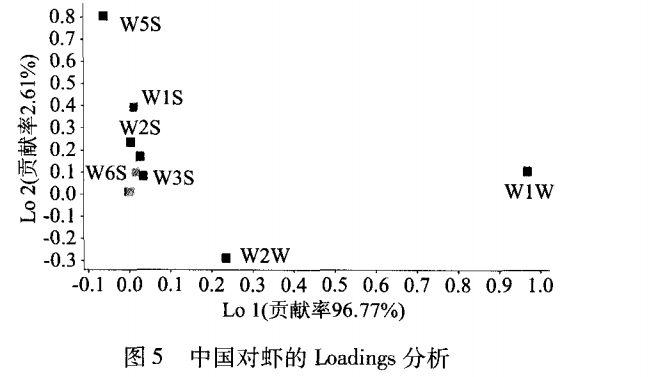 Loadings分析是對不同傳感器的貢獻率進行分析,可以用來判別電子鼻的各個傳感器的相對重要性。如果某一傳感器的響應值接近原點(0,0),則該傳感器的識別作用可以忽略不計;而當傳感器的響應值越偏離原點,則說明該傳感器的識別能力越強。圖 5為空白樣品的 Loadings 分析圖,由圖 5可知,總貢獻率為 99.38% ,其中傳感器 W 1W (無機硫化物)和 W2W (有機硫化物)對第一主成分貢獻率較大,W 5S(氮氧化合物)和的 W 1S(烴類物質)傳感器對第 2 主成分貢獻率較大,W3S(烷烴)和 W6S(氫氣)傳感器則基本接近原點,其貢獻率最小。中國對蝦在貯藏期間由于在微生物的作用,肌肉中的蛋白質、氨基酸及其它含氮物質進一步分解成氨氣、三甲胺、硫化氫、及組胺等,使蝦散發出具有腐敗特征的臭味,這與電子鼻檢測的結果相符,說明通過電子鼻技術可以有效的反映中國對蝦在貯藏過程中揮發性物質的變化。