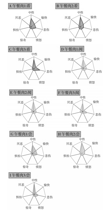 從“看”(視覺(jué))分析得到的情緒雷達(dá)圖見(jiàn)圖2中A~C,能區(qū)別樣品口味的情緒是“悲傷”,午餐肉3占比最高,午餐肉2占比最低。受試者進(jìn)行感官評(píng)價(jià)前,無(wú)影響情緒波動(dòng)的因素存在,因此受試者的情緒表現(xiàn)與食物有關(guān)。在此實(shí)驗(yàn)中,午餐肉3的消極評(píng)價(jià)更高,午餐肉2的消極評(píng)價(jià)最低,說(shuō)明午餐肉2的外部整體特征更能提高實(shí)驗(yàn)者的食欲。從“聞”(嗅覺(jué))分析得到的情緒雷達(dá)圖見(jiàn)圖2中D~F,午餐肉1的氣味積極因素更多,“愉悅”情緒占比較大;而午餐肉3的氣味積極因素較少,消極因素更多。說(shuō)明從氣味上判斷,午餐肉1的氣味更令人有食欲。從“嘗”(味覺(jué))分析得到的情緒雷達(dá)圖見(jiàn)圖2中G~I,午餐肉1和午餐肉2的口感“愉悅”情緒顯著高于午餐肉3;而午餐肉1和午餐肉3的“悲傷”情緒顯著高于午餐肉2,說(shuō)明從口感上判斷,午餐肉2更能提高實(shí)驗(yàn)者的食欲。雖然從嗅覺(jué)評(píng)價(jià)上午餐肉1的氣味最佳,但從視覺(jué)和味覺(jué)上評(píng)價(jià),午餐肉2的外觀和口感最佳。此結(jié)論與傳統(tǒng)的感官評(píng)價(jià)結(jié)論一致,午餐肉2是口感最佳的午餐肉樣品。