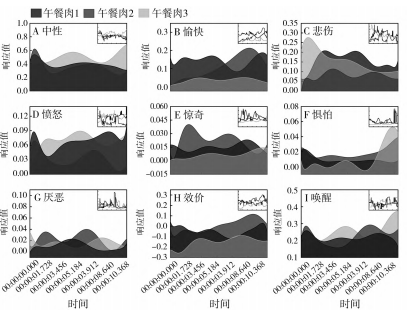 實(shí)驗(yàn)人員觀察3種午餐肉時(shí),情緒喚醒響應(yīng)值維持在0.3左右,機(jī)體對(duì)樣品的反應(yīng)強(qiáng)度類(lèi)似。“中性”表示未引起實(shí)驗(yàn)者情緒表達(dá),“中性”值越高,情緒表達(dá)越低。“愉快”和“驚奇”的響應(yīng)值越高,越能說(shuō)明樣品的可接受度高;而“悲傷”、“憤怒”、“懼怕”和“厭惡”的響應(yīng)值越高,說(shuō)明樣品的可接受度越低。為了描述便利,本文將“中性”標(biāo)為情緒壓制,“愉快”和“驚奇”2種情緒稱為積極情緒,“悲傷”、“憤怒”、“懼怕”和“厭惡”4種情緒稱為消極情緒。從視覺(jué)上分析,午餐肉2引起實(shí)驗(yàn)者的情緒表達(dá)最高,午餐肉1最低;午餐肉3的積極情緒響應(yīng)值明顯低于另外兩種,而午餐肉1比午餐肉2更能使人感到愉悅。從觀測(cè)時(shí)間上看,午餐肉1“愉快”響應(yīng)值突降的時(shí)間正是午餐肉2“驚奇”響應(yīng)值陡增的時(shí)間,說(shuō)明情緒的分配是不平衡的,也可以反映出隨著觀察深入,午餐肉2的某些特征更能獲取實(shí)驗(yàn)者的青睞。從消極情緒上看,3種午餐肉“憤怒”和“厭惡”的響應(yīng)值接近,而“悲傷”和“懼怕”的響應(yīng)值差異更顯著,而這兩種消極情緒都表明午餐肉3的接受度最低,午餐肉2的接受度最高。此結(jié)論和傳統(tǒng)的感官評(píng)價(jià)結(jié)論一致,都表明午餐肉2的外觀更能讓人相信食物“美味”。