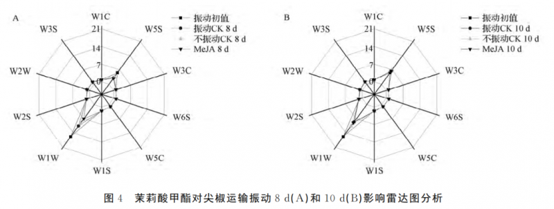 茉莉酸甲酯對尖椒運輸振動影響雷達圖分析