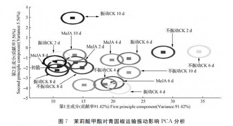對振動組和 MeJA 處理組的尖椒、青 圓 椒 和西蘭花進行檢測,分析運輸振動對蔬菜變化與電子鼻無損檢測間的關系,利用對傳感器響應值進行PCA 方法的分析,實現了蔬菜運輸振動后的新鮮度鑒別。當采用 PCA 方 法分 析 時,電 子 鼻 可以區分處理組與對照組的蔬菜,并且可以區分不同貯藏時間的尖椒和西蘭花。采用雷達圖分析方法可得出,傳感器 W5S、W1W 在檢測中作用最大,對區分蔬菜是否新鮮,是否有商品價值貢獻最大。不振動組的尖椒和西蘭花的氣味改變較小,青圓椒的不振動組和振動組的氣味變化不大,所以減小運輸過程中果蔬的振動可以有效提高果蔬的商品價值。MeJA 可通過激活植物的防御反應和修復外來機械損傷來調控果蔬的品質,用MeJA 處理振動 后 的 尖 椒、青圓椒和西蘭花可以有效抑制尖椒、青圓椒和西蘭花氣味的改變。