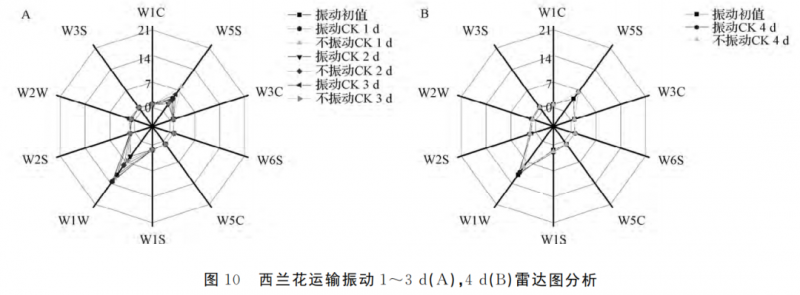 圖10(A)為西蘭花前3d的雷達圖(B 組),前3d西蘭花的氣味變化并不明顯,均接近初值,說明此時的西蘭花新鮮,具有商品價值。4d西蘭花的氣味與 初 值 相 比 明 顯 改 變,2號 和7號 傳感器的響應值變化明顯,此時西蘭花腐爛變質,出現其它氣味,失去商品價值。不振動 CK 組的氣味明顯好于振動 CK 組,說明振動影響西蘭花組織表皮細胞的滲透和細胞壁的降解,并影響運輸后西蘭花的硬度和外部變化,降低商品價值。