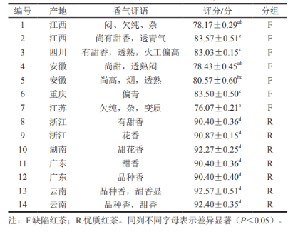 依據專家感官審評結果(表1)將14個茶樣分成兩類:優質紅茶組,用R表示(7個);缺陷紅茶組,用F表示(7個)。優質紅茶組香氣特征主要呈現甜香、甜花香等,從香氣評分來看,優質紅茶香氣評分均高于90分。缺陷紅茶組香氣主要表現為熟悶、不純、駁雜、青草氣強、火工偏高等,其評語中以“偏、透、欠”等傾向性強的副詞修飾較多,從香氣評分來看缺陷紅茶評分則低于85分,。綜上分析可知,兩類紅茶香氣品質存在明顯差異性。