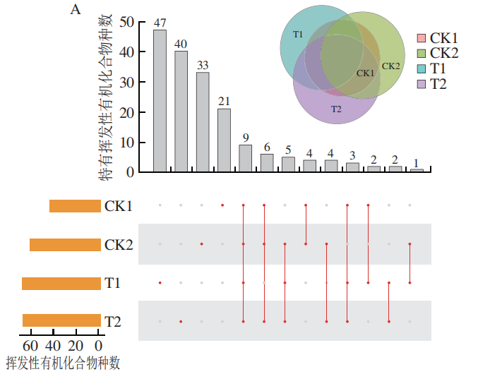 為探究嫩葉和熟葉杜仲茶汽爆前后制成杜仲茶的香氣特征差異,利用HS-SPME-GC-MS聯用對4 種處理杜仲茶的揮發性化合物成分和相對含量進行分析鑒定,得到其總離子流圖(圖4),共檢測到177 種揮發性物質,其中,CK1、T1、CK2和T2中可鑒定的峰面積分別占比92.32%、100.00%、94.50%和100.00%。根據化合物類型將其分為碳氫化合物、雜環類化合物、醇類化合物、醛類化合物、酮類化合物、酯類化合物和其他類化合物。由圖5A可知,CK1、T1、CK2和T2 4 個處理所制的杜仲茶揮發性化合物種數差異顯著,數量排序為T1>CK2>T2>CK1,汽爆處理后的成熟葉茶揮發性化合物種類高于未汽爆處理,增加了16 種,而嫩葉茶汽爆前后揮發性化合物種類無顯著差異。其中,嫩葉茶汽爆后醛類、酮類和雜環類分別增加了2、6 種和3 種,成熟葉茶汽爆后醇類、醛類和酮類分別增加了5、3 種和9 種(圖5B)。CK1、T1、CK2和T2 4 種杜仲茶揮發性化合物相對含量的差異也十分顯著,酯類是相對含量最高的化合物類型,相對含量分別為42.07%、16.33%、23.70%和21.89%;酮類相對含量分別為6.63%、29.05%、12.30%和13.15%;碳氫類的相對含量分別為10.76%、10.83%、14.20%和13.89%;醇類的相對含量分別為9.27%、15.22%、9.48%和14.87%;雜環類的相對含量分別為18.73%、8.83%、14.13%和13.13%;其他類的相對含量分別為0.90%、8.68%、5.25%和4.92%(圖5C)。