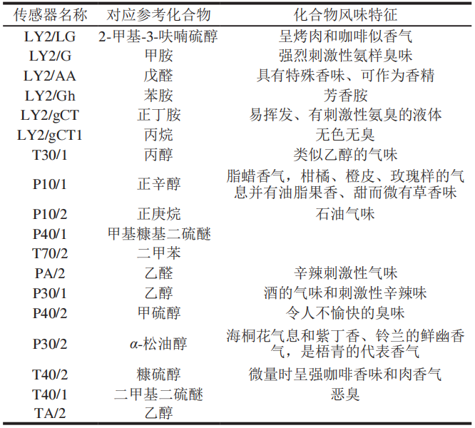 由圖2可知,電子鼻可以有效區分臨床乳房炎牛乳和健康牛乳樣品,PC1貢獻率達92.7%,可以很好地反映樣品的整體信息。電子鼻的18 個傳感器對兩種牛乳的風味化合物皆有響應,并且響應值各不相同。除LY2/LG傳感器響應強度差異不顯著,其余17 個傳感器對兩種牛乳的響應值均表現出顯著差異(P<0.05)。在健康牛乳中,T70/2、T40/2傳感器有顯著響應,對應香氣增加。在乳房炎牛乳中,P30/1、LY2/gCT、P40/2、LY2/G等傳感器具有顯著響應,對應的不愉快臭味增加。結合傳感器對應參考化合物的風味特征,由表2可知,奶牛患乳房炎后,其分泌的乳汁不新鮮,存在一定的刺激性氣味,加工價值降低。
