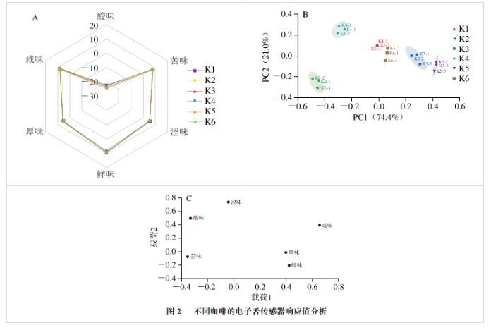 02 不同咖啡的滋味輪廓分析利用電子舌快速分析滋味輪廓,如圖2A所示。6種樣品的雷達(dá)圖輪廓類似,只有酸味傳感器的響應(yīng)值為負(fù),說明酸味對咖啡整體滋味的貢獻(xiàn)較小。各樣品在鮮味與咸味傳感器上的響應(yīng)值差異最大,表明這兩種傳感器對滋味特征的區(qū)分效果最好。為根據(jù)滋味特征進(jìn)一步區(qū)分6種咖啡,對電子舌傳感器響應(yīng)值結(jié)果進(jìn)行PCA(圖2B)。6種咖啡輪廓未重疊,滋味特征明顯,易被區(qū)分。K3、K5和K6咖啡在PC1的正方向,主要受鮮味、咸味、厚味影響;K1、K2和K4咖啡在PC1的負(fù)方向,主要由澀味、酸味、苦味影響(圖2C)。每個樣品聚類的距離與滋味特征接近度相關(guān),有相同咖啡配比的K1~K4樣品,烘焙程度不同,距離較遠(yuǎn),說明電子舌可以區(qū)分不同烘焙度的咖啡。K5、K6咖啡分別與K1、K3咖啡輪廓接近,說明不同的咖啡配比在一定程度上能夠彌補(bǔ)烘焙程度的差異,使不同烘焙度的咖啡具有類似的滋味輪廓。