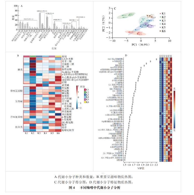 通過PLS-DA對不同咖啡代謝小分子的關(guān)系進(jìn)行綜合分析。由圖4C可知,K1、K2是淺度烘焙咖啡,在PC1的負(fù)半軸,中度、中深度烘焙咖啡在PC1的正半軸、原點(diǎn)附近,可以明顯區(qū)分。由圖4D可知,L-酪氨酸乙酯、色氨酸-丙氨酸、纈氨酸-天冬酰胺等12種氨基酸及肽類似物,巴豆酸、戟葉馬鞭草苷等5種脂類,鳥嘌呤、1-甲基腺苷等48 個化合物是引起各樣品差異的主要差異代謝物(變量投影重要性(VIP)>1.5)。區(qū)分6 種不同咖啡的烘焙度及產(chǎn)地,可直接選用部分呈滋味化合物,如胞嘧啶核苷、賴氨酸、新橙皮糖等,但更多的是與咖啡的非呈滋味代謝物有關(guān)。有研究通過超高效液相色譜串聯(lián)質(zhì)譜進(jìn)行代謝組學(xué)分析得到36 種云南小粒咖啡與埃塞俄比亞咖啡的潛在標(biāo)志物,包括多酚16 種、脂質(zhì)類8 種、糖類6 種以及少量生物堿類、有機(jī)酸類、萜類。