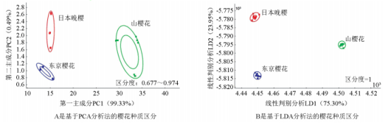采用PCA和LDA法對3種櫻花進行分析(圖3),從圖3可以看出,不同種櫻花的樣本點沒有重疊,每種櫻花樣本點均有特定的分布區域。PCA結果顯示第一主成分PC1的貢獻率為99.33%,第二主成分PC2的貢獻率為0.49%,這兩個主要成分解釋了總方差的99.82%(圖3A),不同種質區分度達到0.677~0.974。從LDA分析結果可以看出(圖3B),判別式LD1和判別式LD2的貢獻率分別為75.30%和23.95%,總貢獻率達到99.25%,稍低于PCA的總貢獻率(99.82%),但不同種質區分度為1高于PCA分析的區分度,并且從LDA分析圖中發現,每種櫻花樣本點相比于PCA樣本點更為集中。