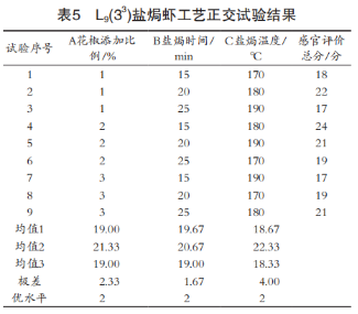 由表2極差值分析可知,各因素對感官評價的影響由強到弱依次為鹽焗溫度>花椒添加比例>鹽焗時間,即鹽焗溫度對感官評價分數影響最大。最終確定的鹽焗蝦的優化工藝為A2B2C2,即花椒添加比例2%、鹽焗時間20 min和鹽焗溫度180 ℃。按此最優工藝進行3次驗證,所得鹽焗蝦的感官評分平均分為24.8分。
