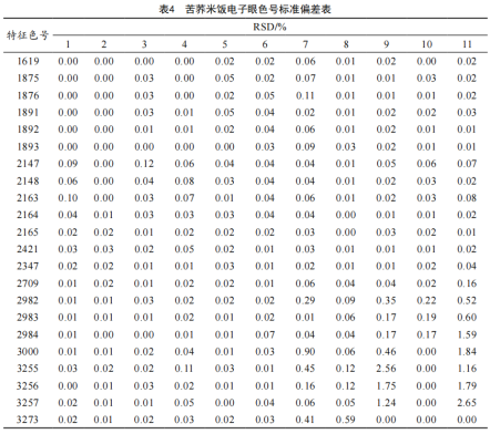 通過電子眼檢測,占比在1%以上的特征色號有22個。其中,隨著苦蕎米添加量的增加,占比在增大的特征色號有13個,如:1619、1875、1876、1891、1892、1893、2147、2148、2163、2164、2165、2421、2437;隨著苦蕎米添加量的增加占比在減少的特征色號有9個,如:2709、2982、2983、2984、3000、3255、3256、3257、3273。為驗證電子眼采集圖像的穩定性,以確保實驗數據的可靠性,計算樣本的相對標準偏差(Relative standard deviation, RSD),結果如表4所示。樣本特征色號RSD值均小于5%,表明電子眼采集的苦蕎米飯色澤數據具有良好的重現性,可滿足后續分析。