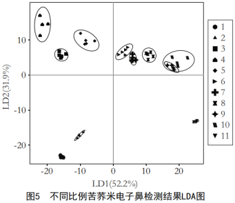 經電子鼻測定的線性判別分析如圖2所示。由圖可知,LD1的貢獻率為52.2%,LD2的貢獻率為31.9%,其累計貢獻率為84.1%,能夠反映樣品中的大部分氣味信息。1、2、11號樣本與其余樣本距離較遠,表明了1、2、11號樣本與其余樣本之間的差異較大。6~10號樣本距離較近,存在部分重疊現象,說明這幾組樣本氣味相似,并且隨著苦蕎米添加量的增大,樣本呈現出從左向右依次移動的趨勢。1、2號樣本米飯的香味較重、苦蕎的香味較淡,苦蕎香味從3號樣本開始逐漸明顯,11號樣本苦蕎味過重。