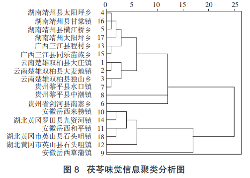 圖7為電子舌檢測(cè)結(jié)果的響應(yīng)值降維后所得的主成分分析結(jié)果。總體來看,西南地區(qū)(云南、廣西、貴州)的茯苓樣品與岳西地區(qū)(安徽、湖北)的茯苓樣品能夠得到大致劃分。