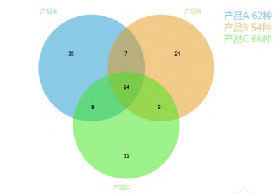 表2展示了不同市售霉莧菜梗中檢測出揮發性成分種類、數量和含量存在差異,這可能和霉莧菜梗的發酵原料、微生物以及發酵過程有關。采用NIST11標準譜庫檢索進行對比定性分析,保留相似度大于80%的化合物,共檢測出揮發性風味成分117種,其中醛類15種、醇類32種、酯類20種、酮類11種、酸類5種、酚類6種烷類10種、烯烴類12種、醚類2種和其他類5種(表2)。不同市售霉莧菜梗鑒定出的揮發性成分數量不同,產品A、B、C分別鑒定出62、54、66種揮發性風味成分,3種霉莧菜梗共有揮發性風味成分有24種(圖3)。
