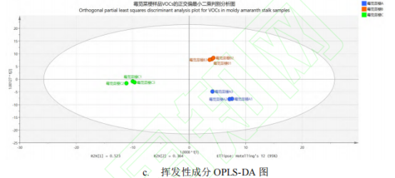 產品A揮發性風味成分中OAV>100000有己酸乙酯、辛醛、正壬醛、大馬士酮,其中大馬士酮是產品A特有的揮發性香氣成分,具有煙草氣味;產品B與產品A不同的是,B中獨有且OAV最大的成分是(2E)-2-癸烯醛,具有家禽氣味;產品C中OAV>100000有己酸乙酯、芳樟醇、對甲酚,其中芳樟醇是產品C特有的揮發性香氣成分,且OAV值大于產品C中其他香氣成分,有檸檬味。所以大馬士酮產生的煙草味、(2E)-2-癸烯醛產生的家禽味和芳樟醇產生的檸檬味是區分3個霉莧菜梗產生不同氣味的原因之一。總體而言,OAV≥1的成分較多,這些成分混合在一起構成了霉莧菜梗獨特的風味。揮發性成分含量PCA、OPLS-DA和VIP結果