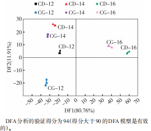 為進一步分析不同包裝方式醇化片煙香氣成分的差異,對3個醇化期不同包裝方式的片煙樣品揮發(fā)性成分指紋圖譜進行了判別因子分析(DFA),結(jié)果如圖5所示。電子鼻的判別因子影響值總和為92.67%(DF1為80.76%,DF2為11.91%),驗證得分94。從DFA模型圖中可以看出,醇化12、14月時,兩種包裝煙葉的氣味主要在DF2有明顯區(qū)別;而醇化16月時,充氮包裝與常規(guī)包裝的片煙在DF1和DF2均有差別。整體來看,DFA判別模型結(jié)果與氣味指紋圖譜的PCA分析結(jié)果相吻合,說明通過電子鼻能有效區(qū)分不同包裝方式醇化片煙樣品揮發(fā)性成分的差異。