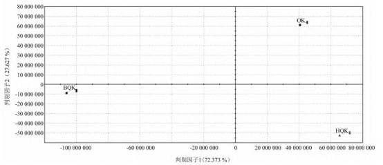 由圖6可知:PC1和PC2對總方差的貢獻率分別為81.656%和18.299%,總和接近100%,說明電子眼能夠區分3種氣流膨化青稞膨化米。由圖7可知:72.373%為第1區分指數,27.627%為第2區分指數,二者累計為100%。可見判別因子分析3種色澤氣流膨化青稞米顏色差異的效果更好,膨化白色青稞米和膨化黑色青稞米在顏色上存在較大差異,膨化青色青稞米分別與膨化白色青稞米、膨化黑色青稞米在顏色上存在較小差異。由圖8可知:3種色澤氣流膨化青稞米顏色差異明顯。